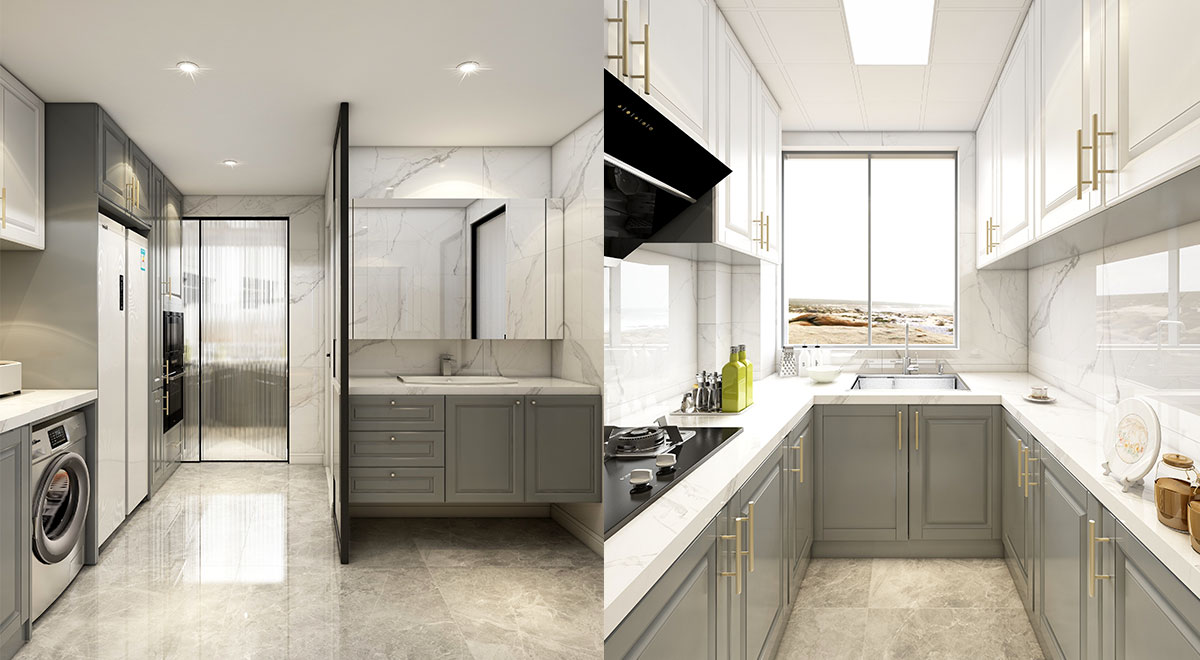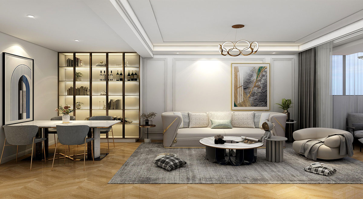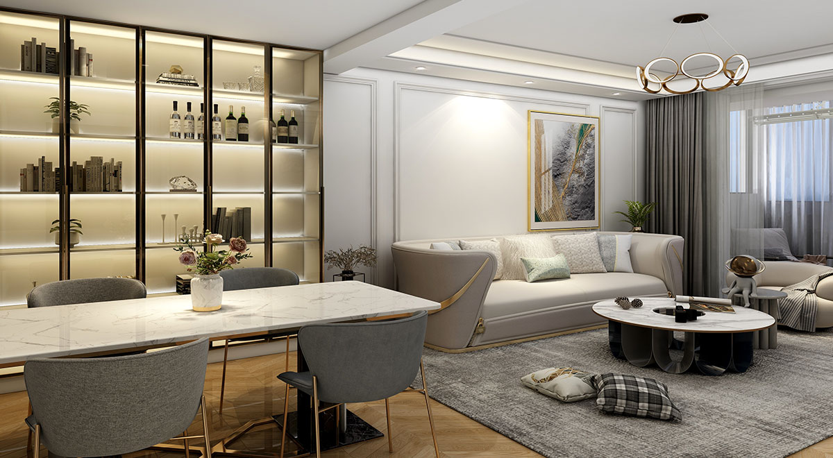 本案是舊房改造,常住人口是一對(duì)時(shí)尚的中年夫妻。業(yè)主的訴求是希望擴(kuò)大客廳的視覺面積。布局上我們把衛(wèi)生間往北推,廚房改成中西廚,客餐廳融為一體。風(fēng)格上以美式輕奢為格調(diào),巧妙運(yùn)用優(yōu)雅簡潔的白色石膏線造型,加以點(diǎn)綴金色線條,讓空間揮發(fā)著自由與貴氣。細(xì)膩的線條,優(yōu)雅的結(jié)構(gòu),塑造不同一般的居室美感。