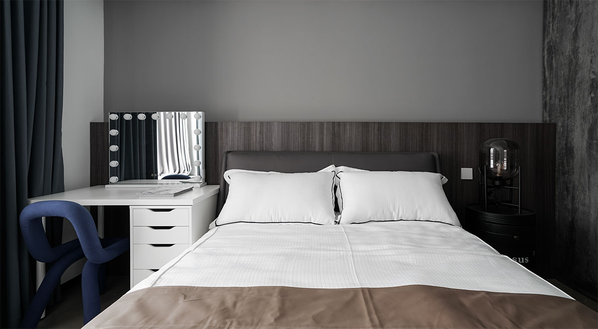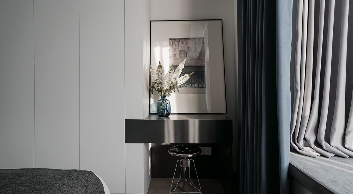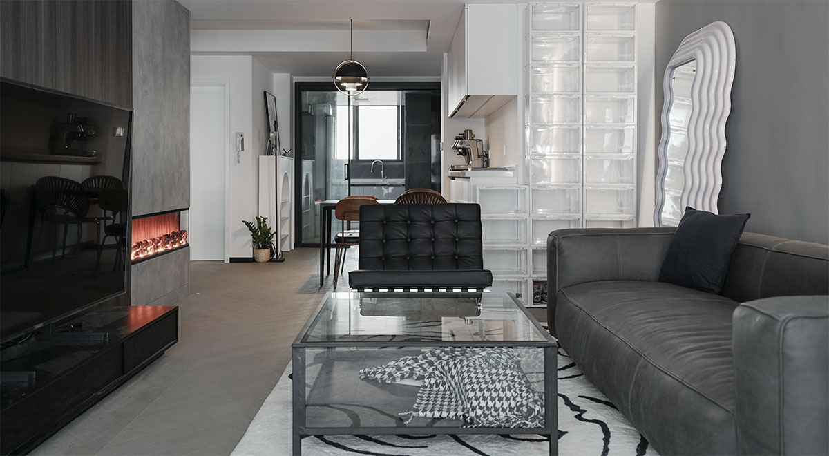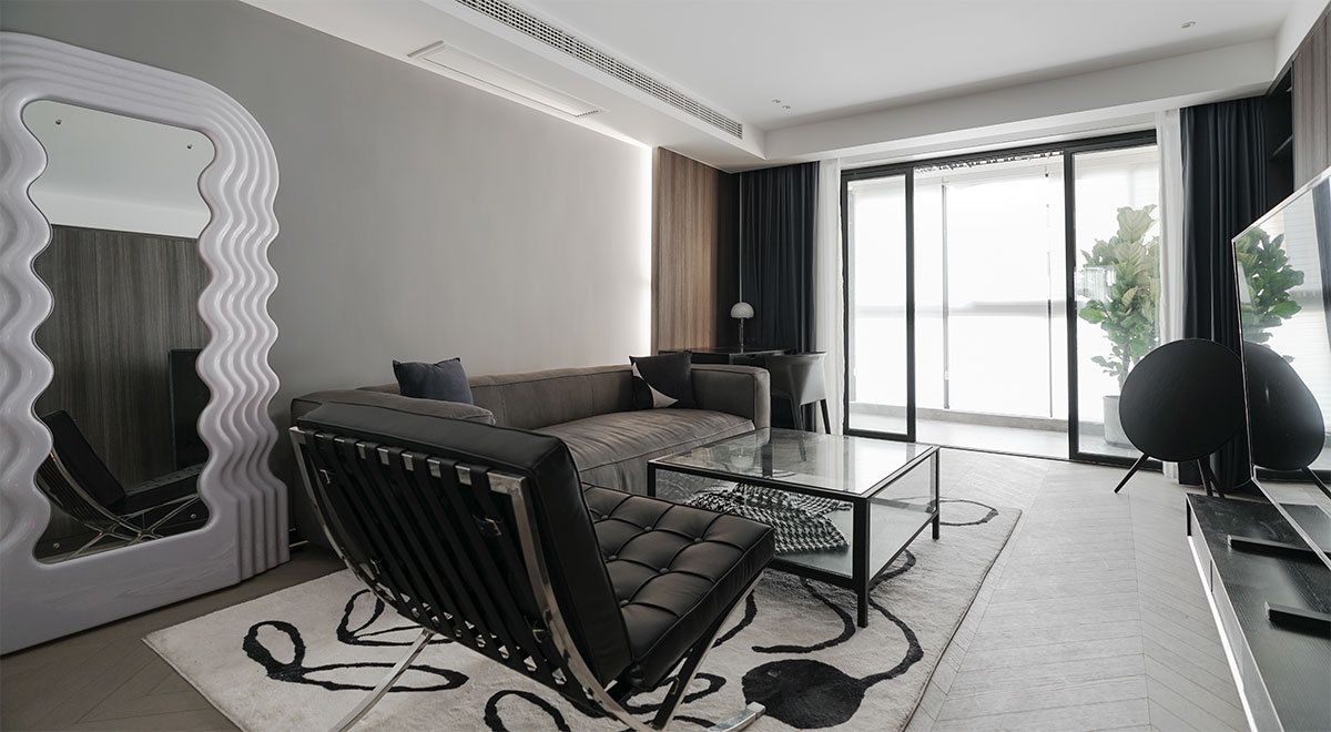 以極簡風(fēng)格為主,利用軟裝打造極具質(zhì)感的家。巴塞羅那椅、摩登復(fù)古的波浪鏡,彰顯屋主的居家品味。
